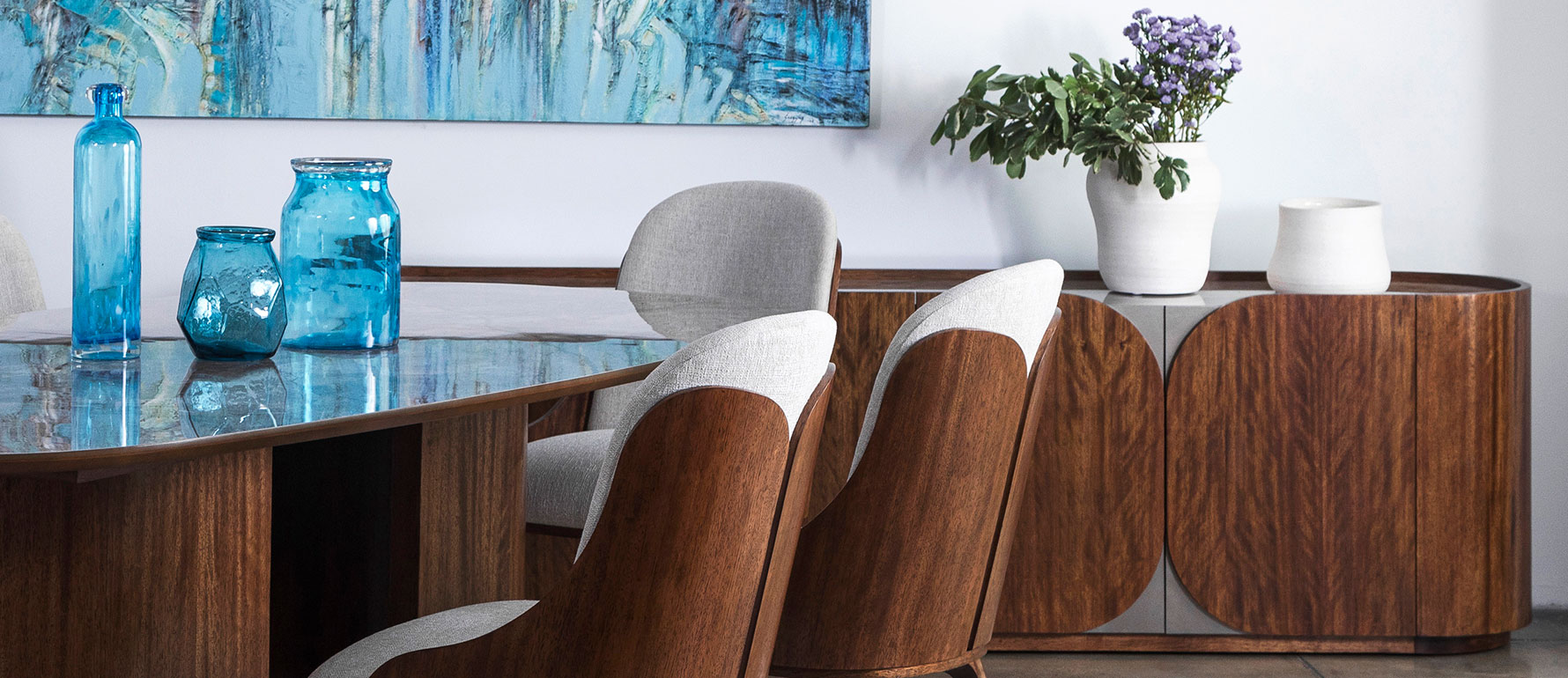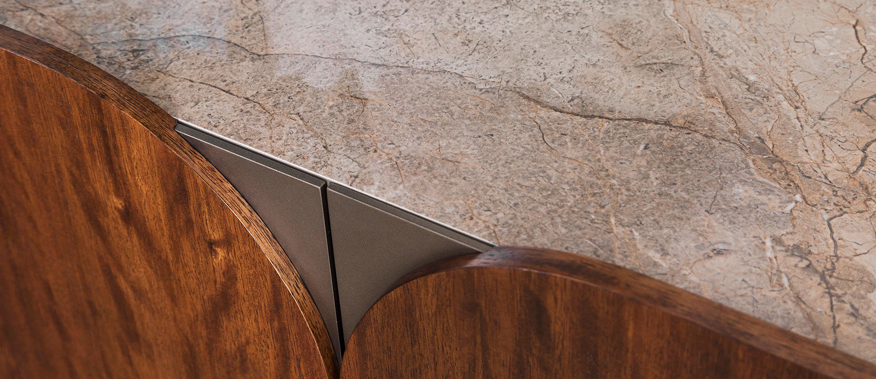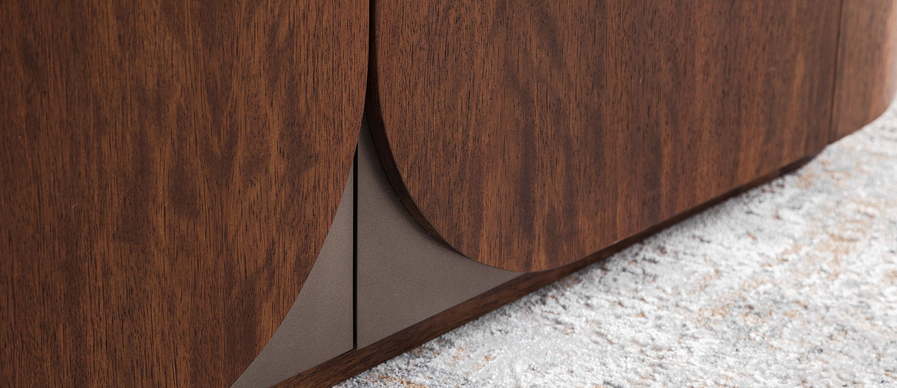 El Aparador Aston se caracteriza por su estructura envolvente en madera, un top de porcelanato de alta resistencia y puertas curvas que definen una silueta sofisticada y singular. Su estética moderna lo convierte en el complemento perfecto para proyectos que buscan muebles premium con identidad propia.