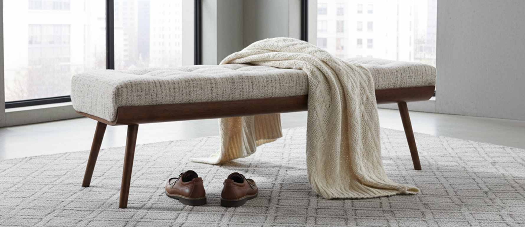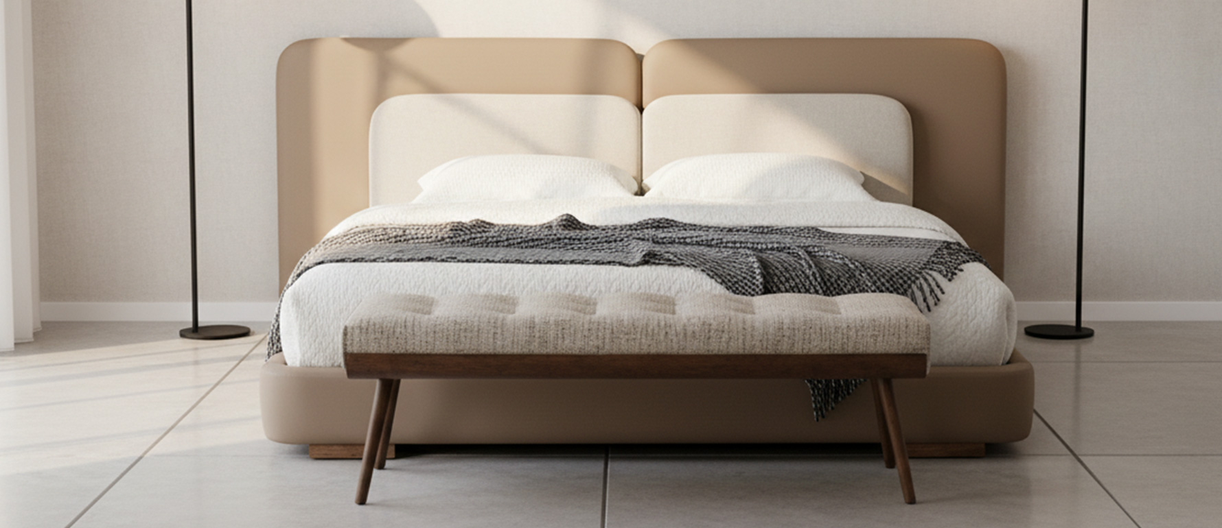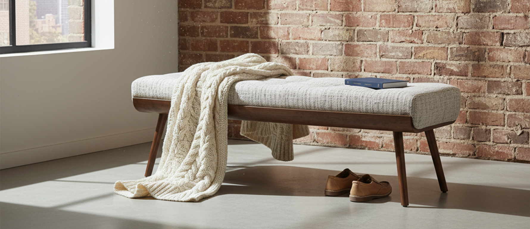 La Banca Baqueira es la pieza perfecta para el pie de la cama o para complementar un dormitorio elegante. Su estilo moderno se combina con patas de madera estilizadas que aportan ligereza visual y refinamiento. Fabricada en Ecuador por StudioNoa, puede personalizarse con distintas telas y acabados, creando armonía con la paleta y atmósfera del espacio.