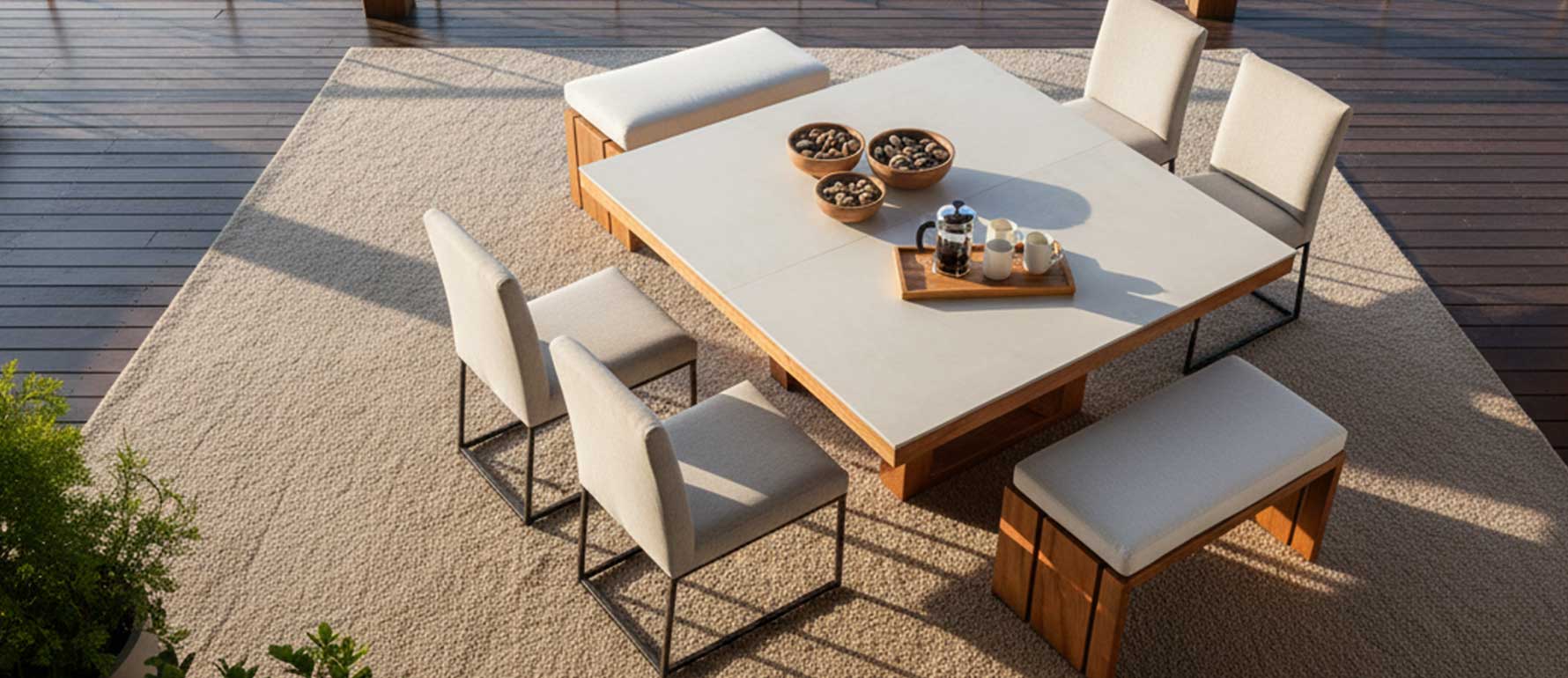 Inspirada en el estilo de Punta del Este, esta banca aporta simplicidad elegante, resistencia y un look mediterráneo contemporáneo ideal para espacios exteriores cubiertos.
