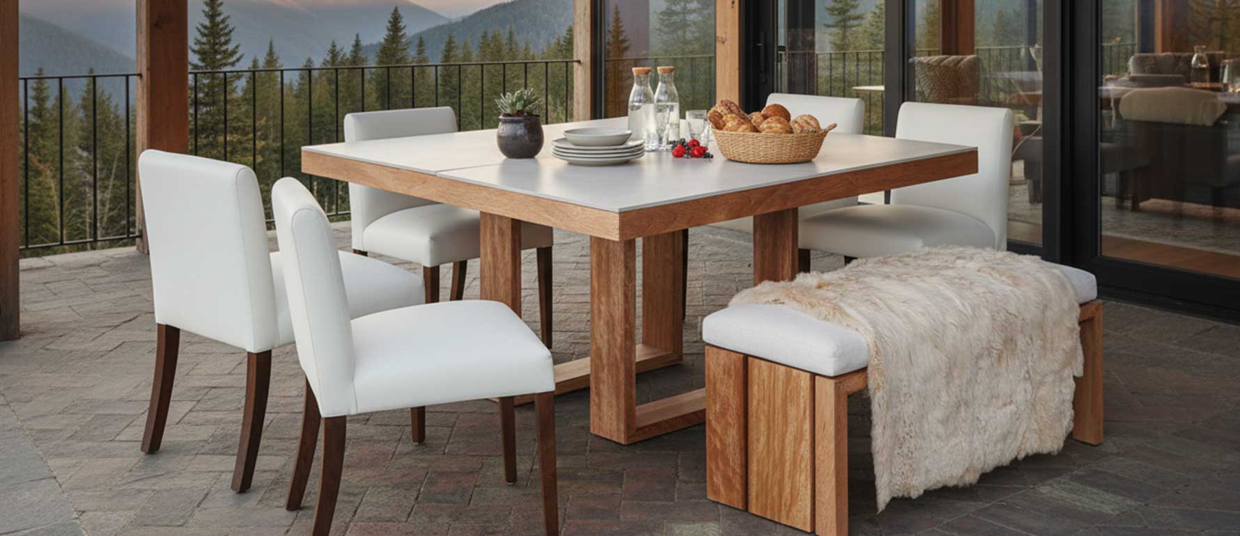 La Banca Punta del Este es una opción moderna y sólida para mesas de comedor en porches techados. Fabricada con madera sieke natural, destaca por sus líneas rectas y su diseño estructural cuadriculado que resalta la estética natural de la madera.