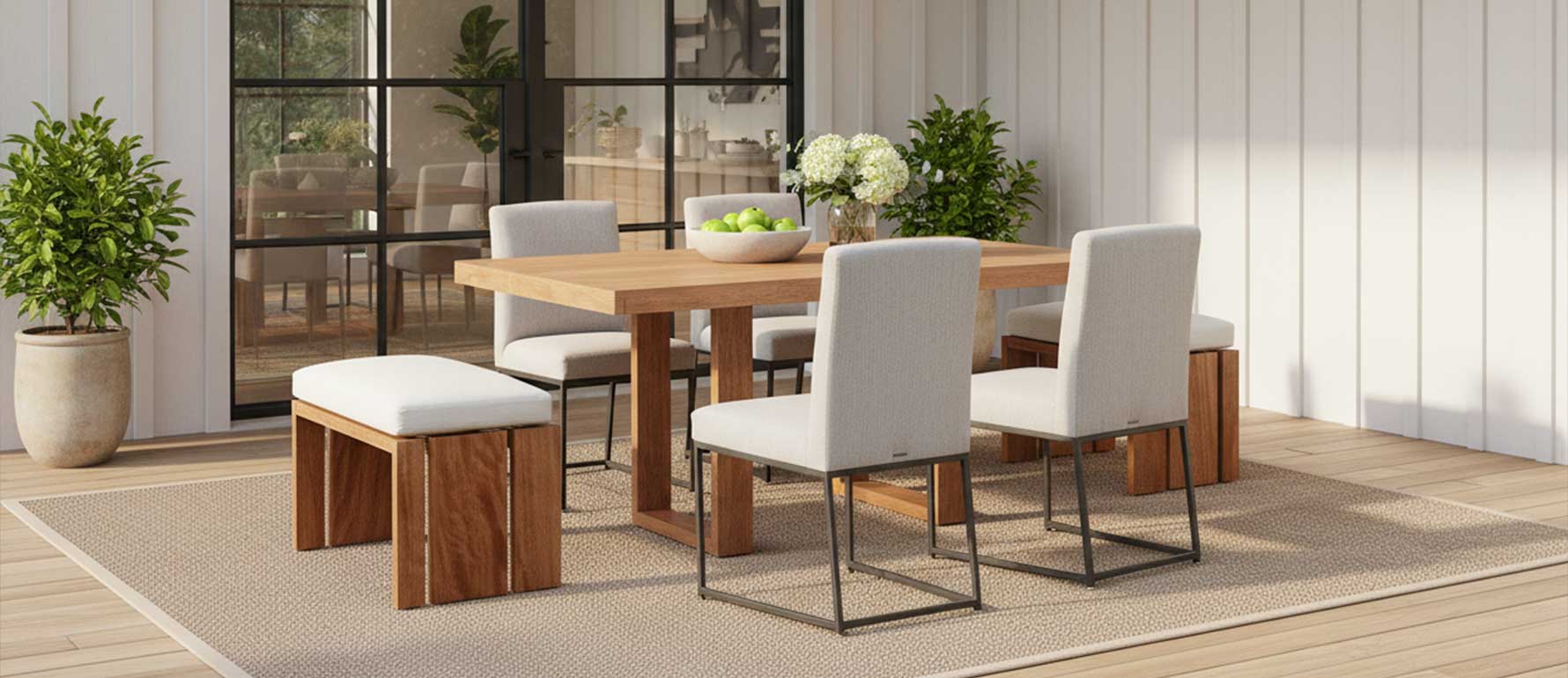 Inspirada en el estilo de Punta del Este, esta banca aporta simplicidad elegante, resistencia y un look mediterráneo contemporáneo ideal para espacios exteriores cubiertos.