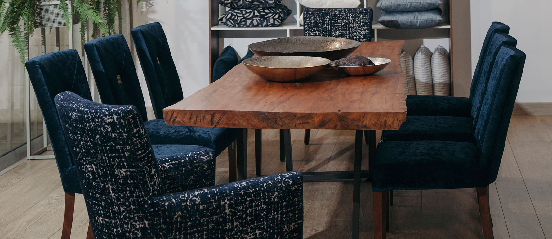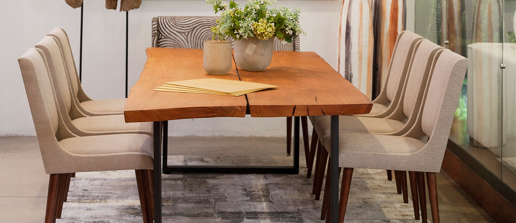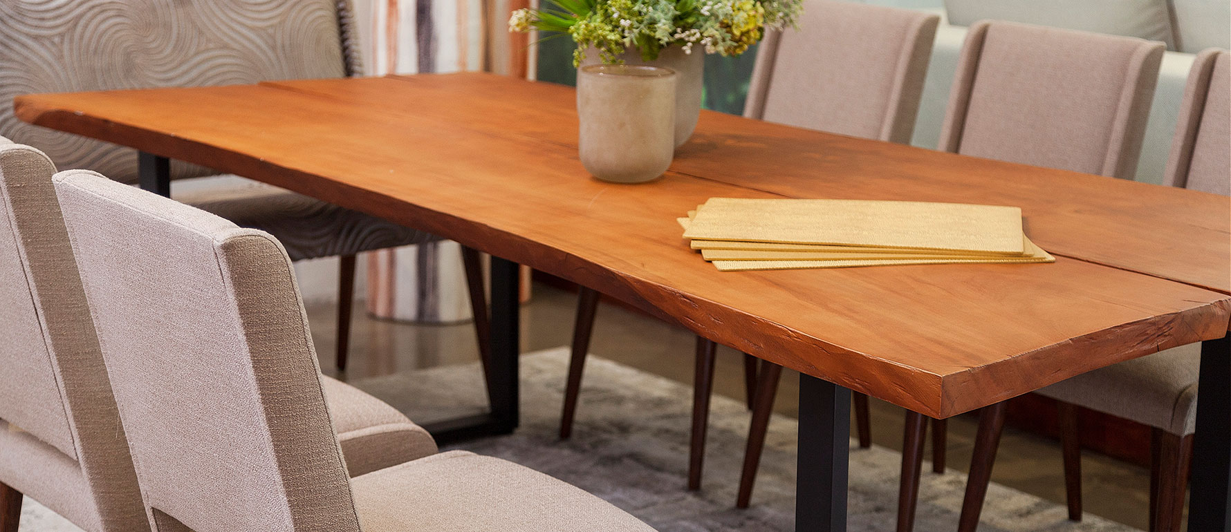 La mesa Natura celebra la belleza de la madera auténtica: un tablón único, natural y orgánico que varía según la especie disponible (roble, chanul, eucalipto, etc.). Sus bases metálicas aportan estabilidad y un contraste contemporáneo.