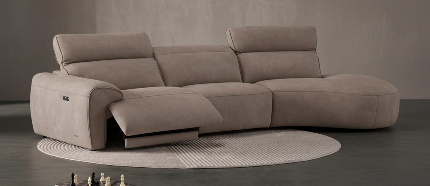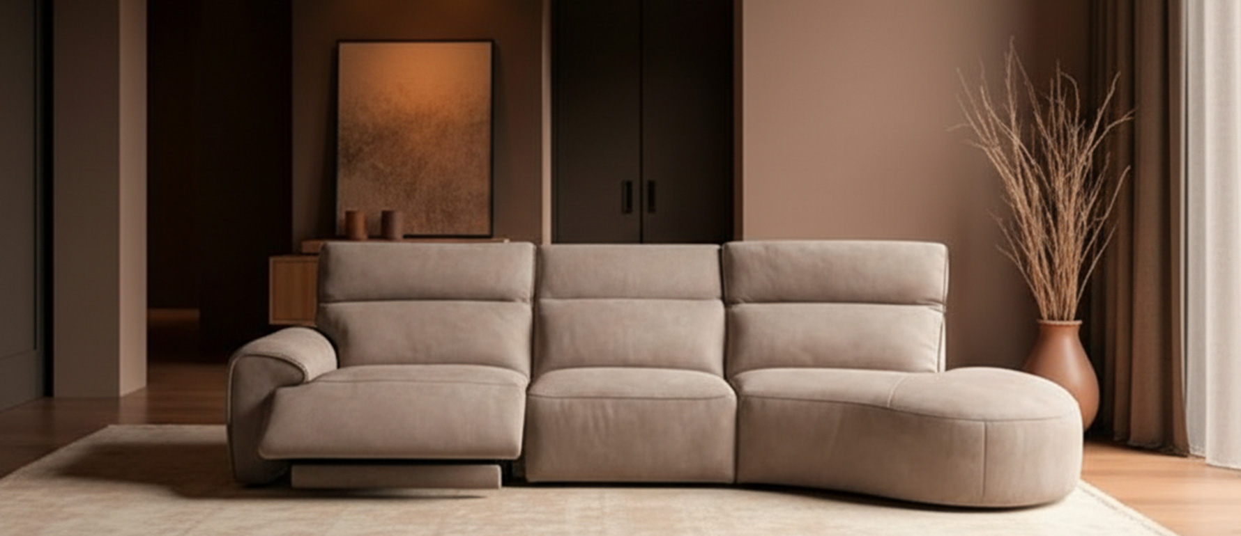 Este sofá modular incorpora mecanismos reclinables: un módulo con reclinación completa y otro con reclinación independiente en la cabecera, permitiendo adaptar la postura según el momento. Disponible en cuero color camel y beige, y en versiones lado izquierdo o lado derecho, lo que lo convierte en una solución versátil para diferentes espacios.