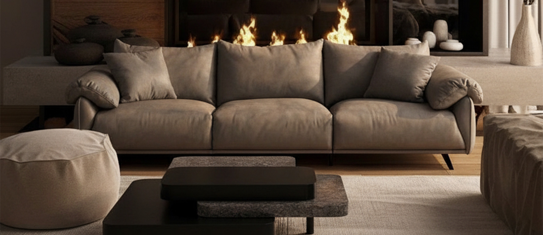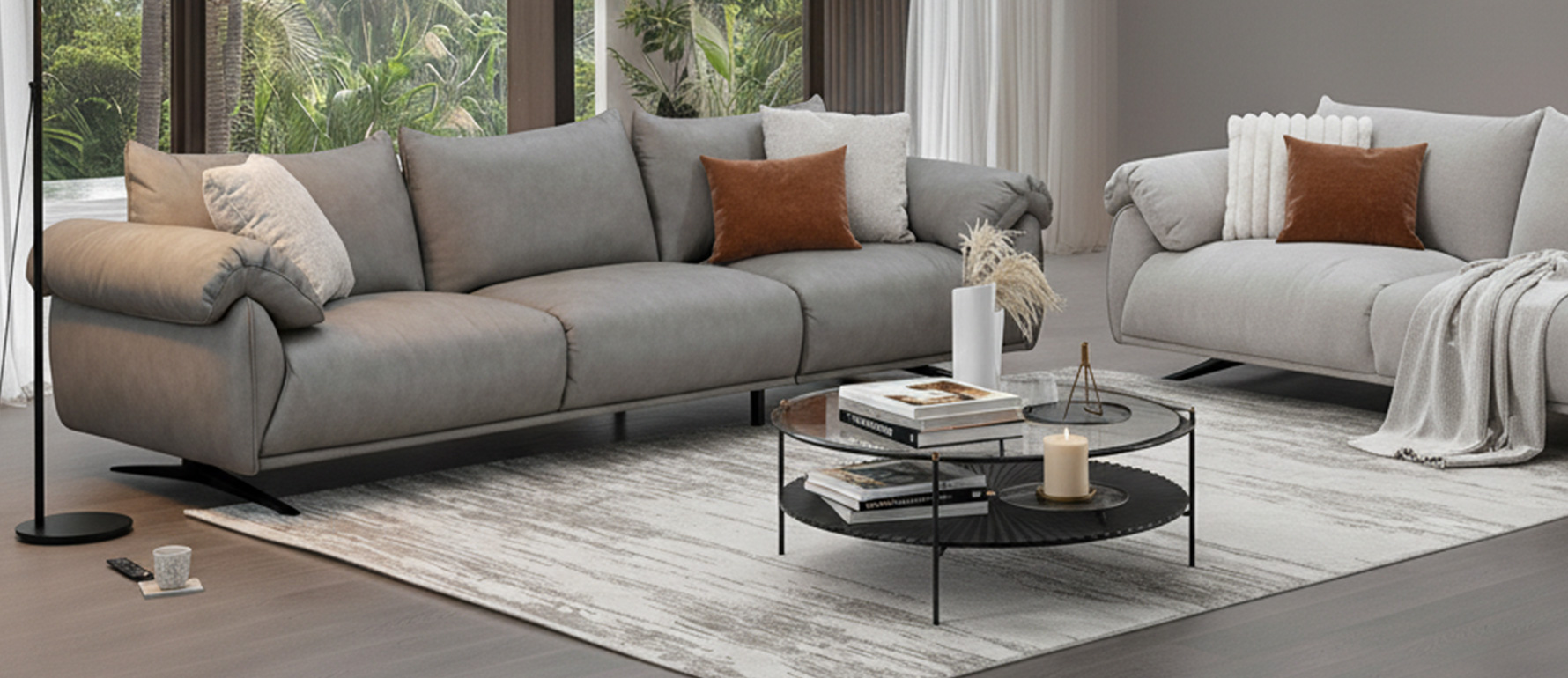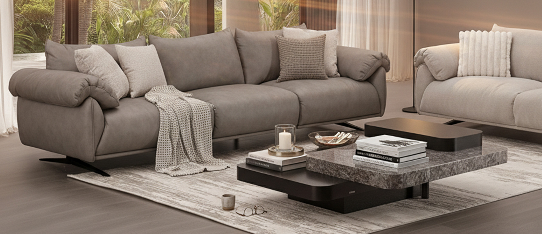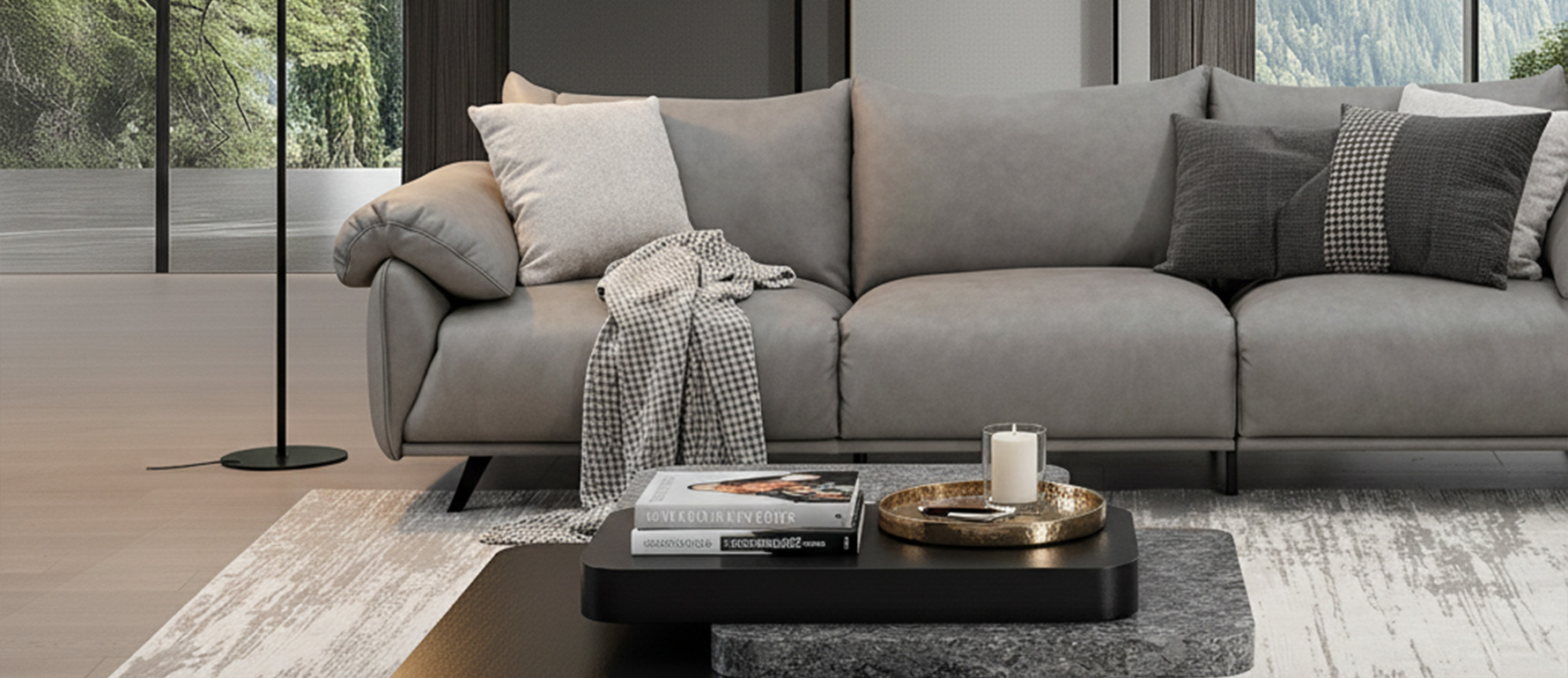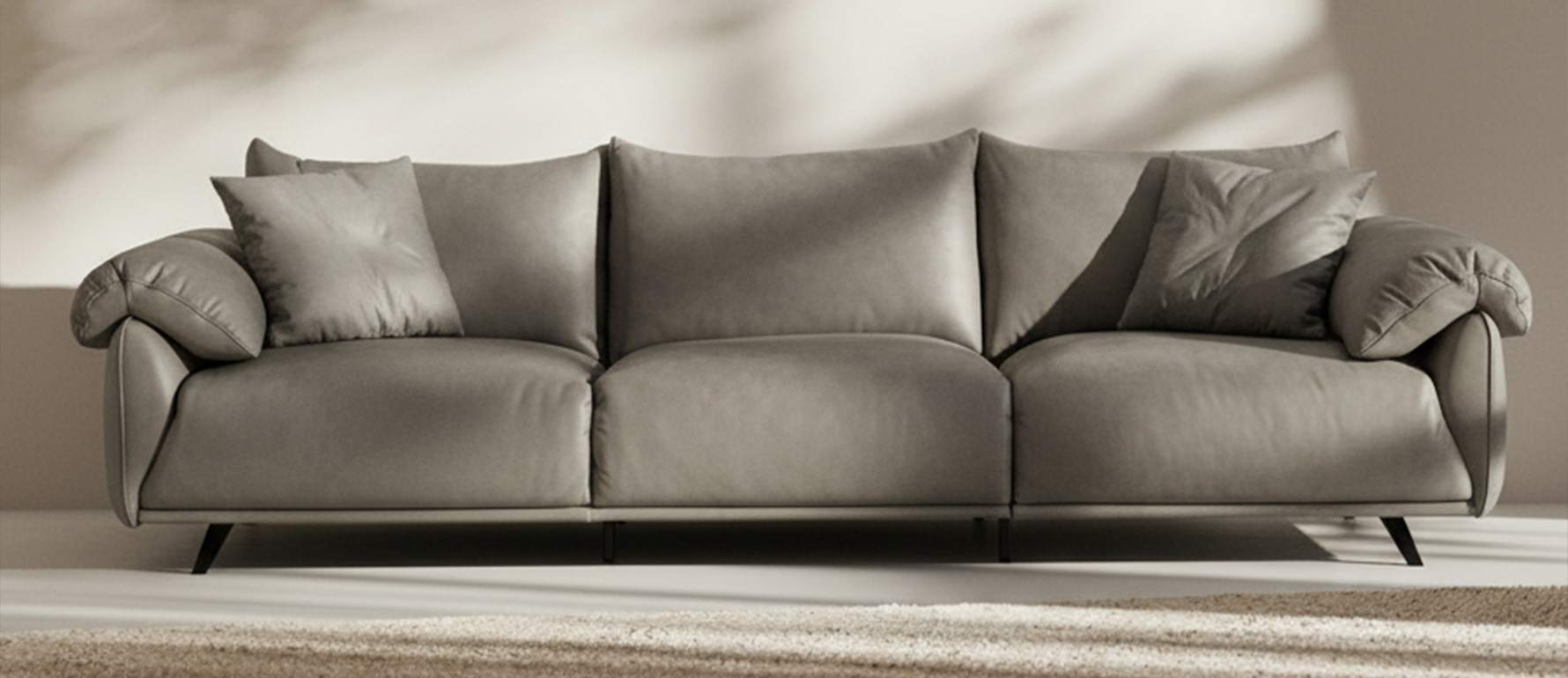 Un sofá de cuero importado, exclusivo de StudioNoa, ideal para salas modernas y sofisticadas.