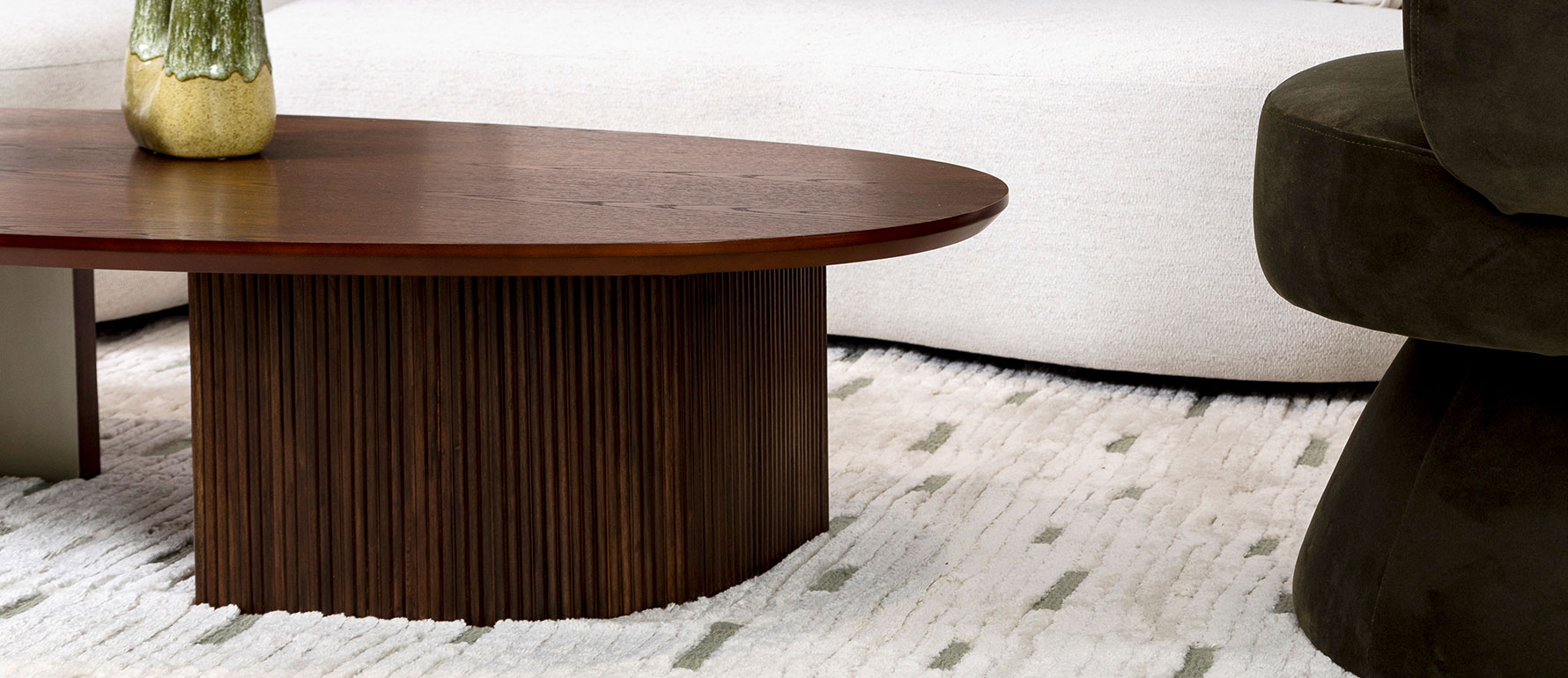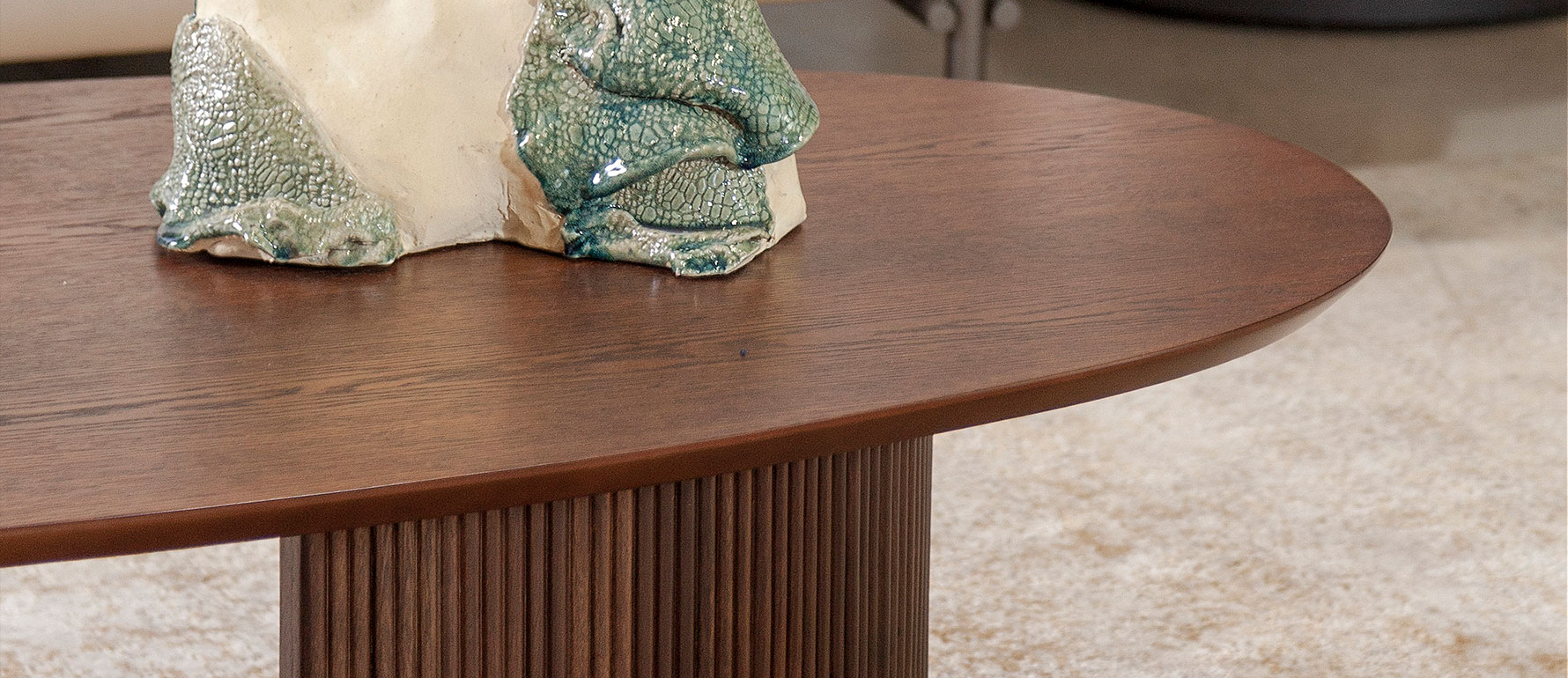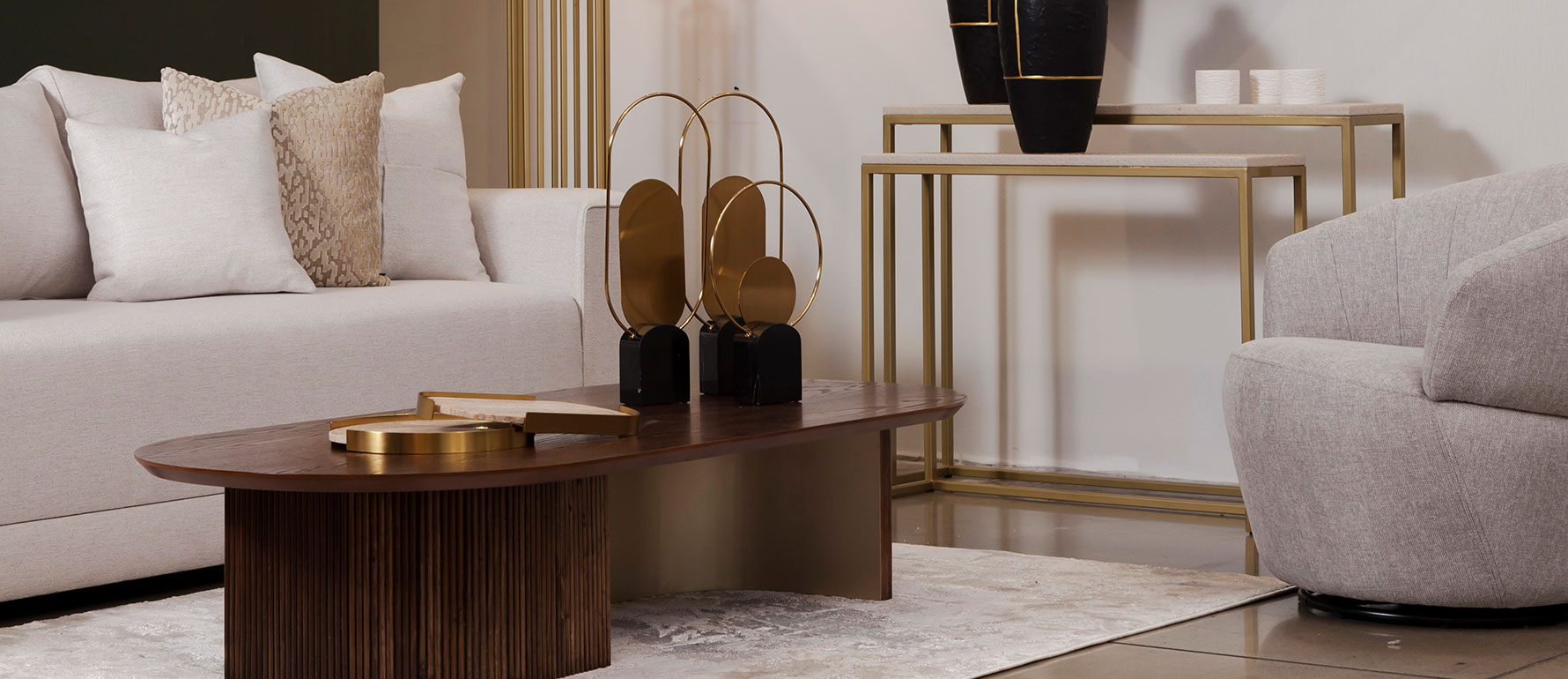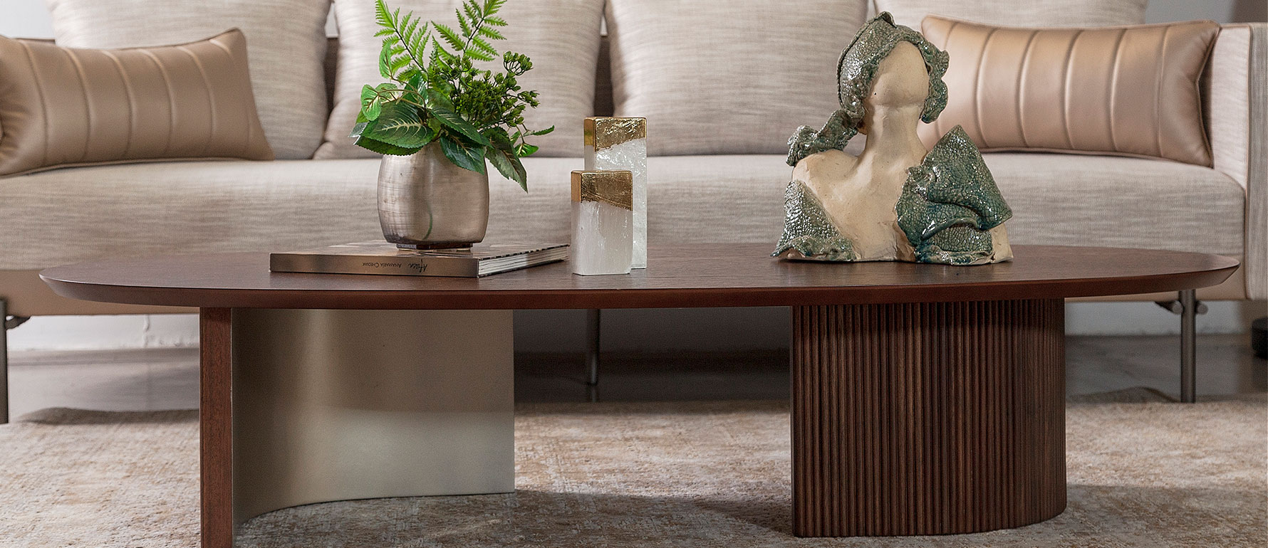 La Mesa de centro Ohla, diseñada y fabricada en Ecuador por StudioNoa, es una pieza que combina diseño contemporáneo, funcionalidad y materiales de alta gama. Sus patas semi circulares con madera ranurada crean un contraste elegante con el acabado metálico interior, aportando un estilo único y sofisticado a cualquier sala.